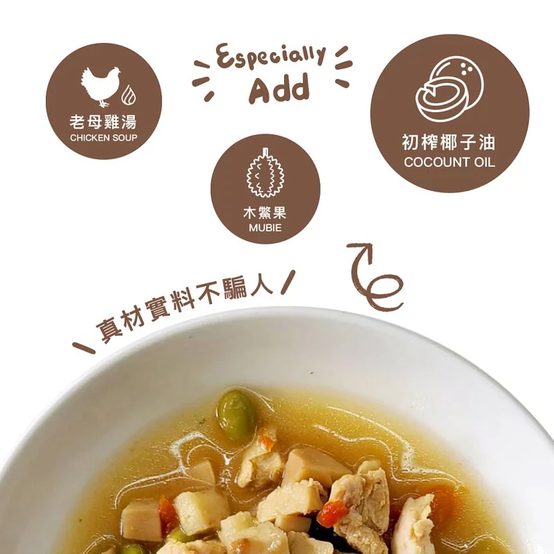 雞肉、雞軟骨、杏鮑菇、雞肝、雞胗、花椰菜、蕃茄丁、地瓜、季節時蔬、雞湯、椰子油、木鱉果、羅勒粉、綜合維生素礦物質