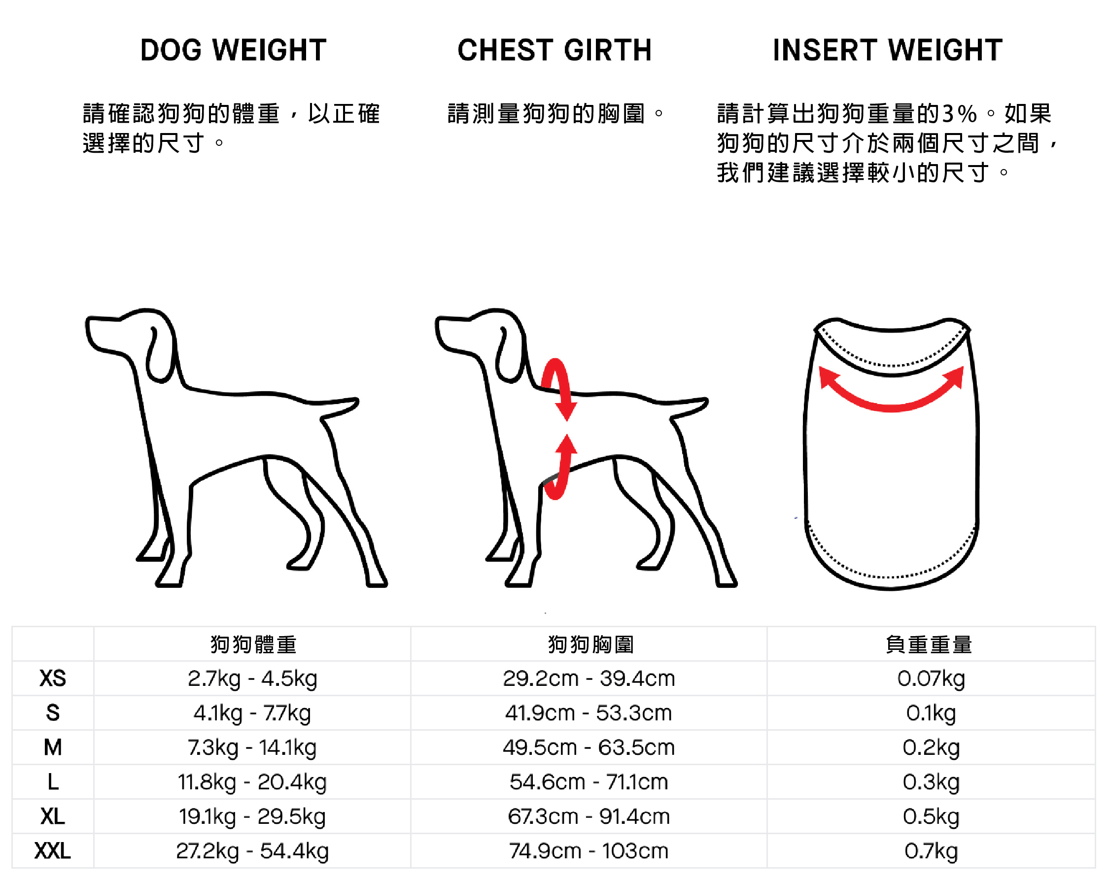 請按照下方的尺寸指南進行選擇,確保重量舒適地落在狗狗的肩膀上。