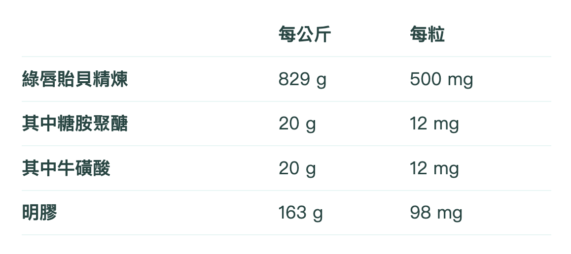- 每顆膠囊含有 500 mg紐西蘭綠唇貽貝濃縮物