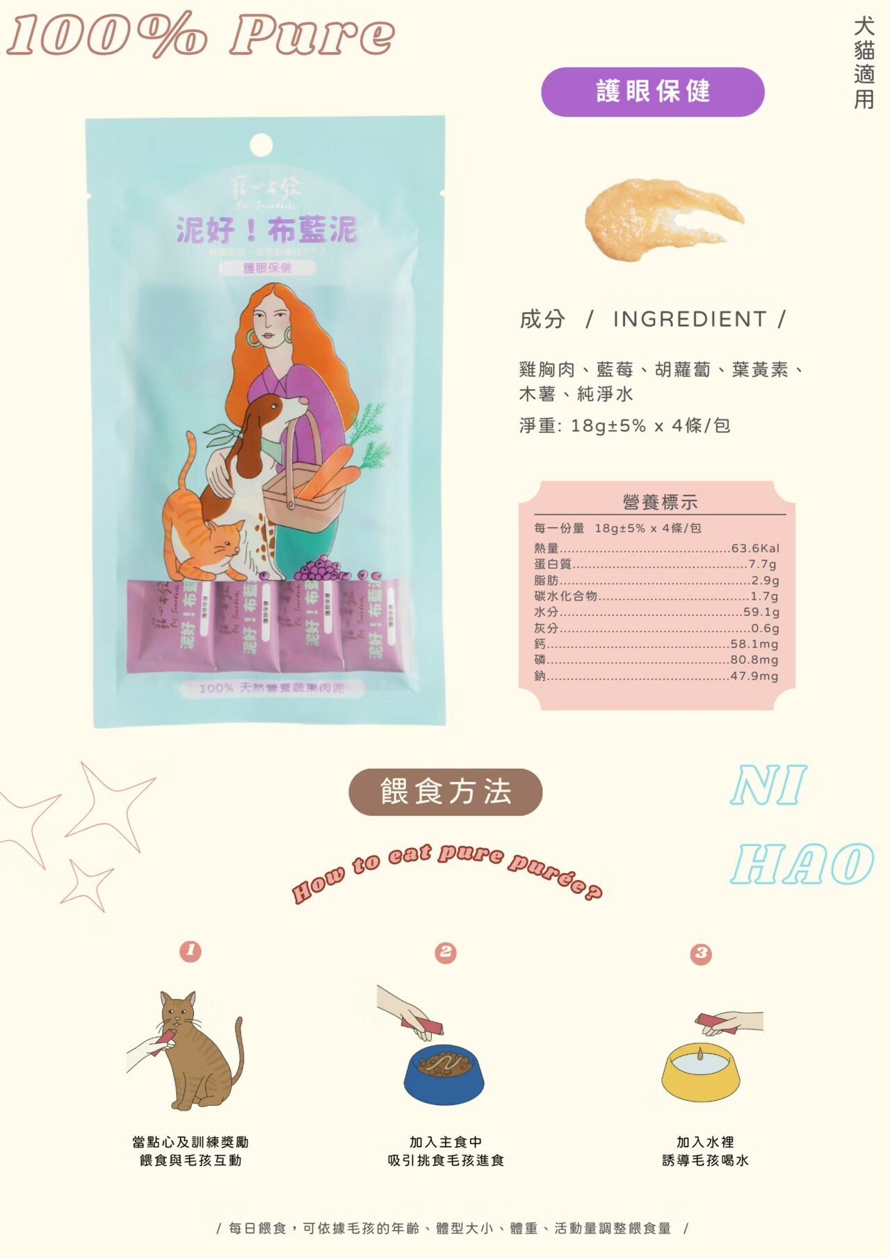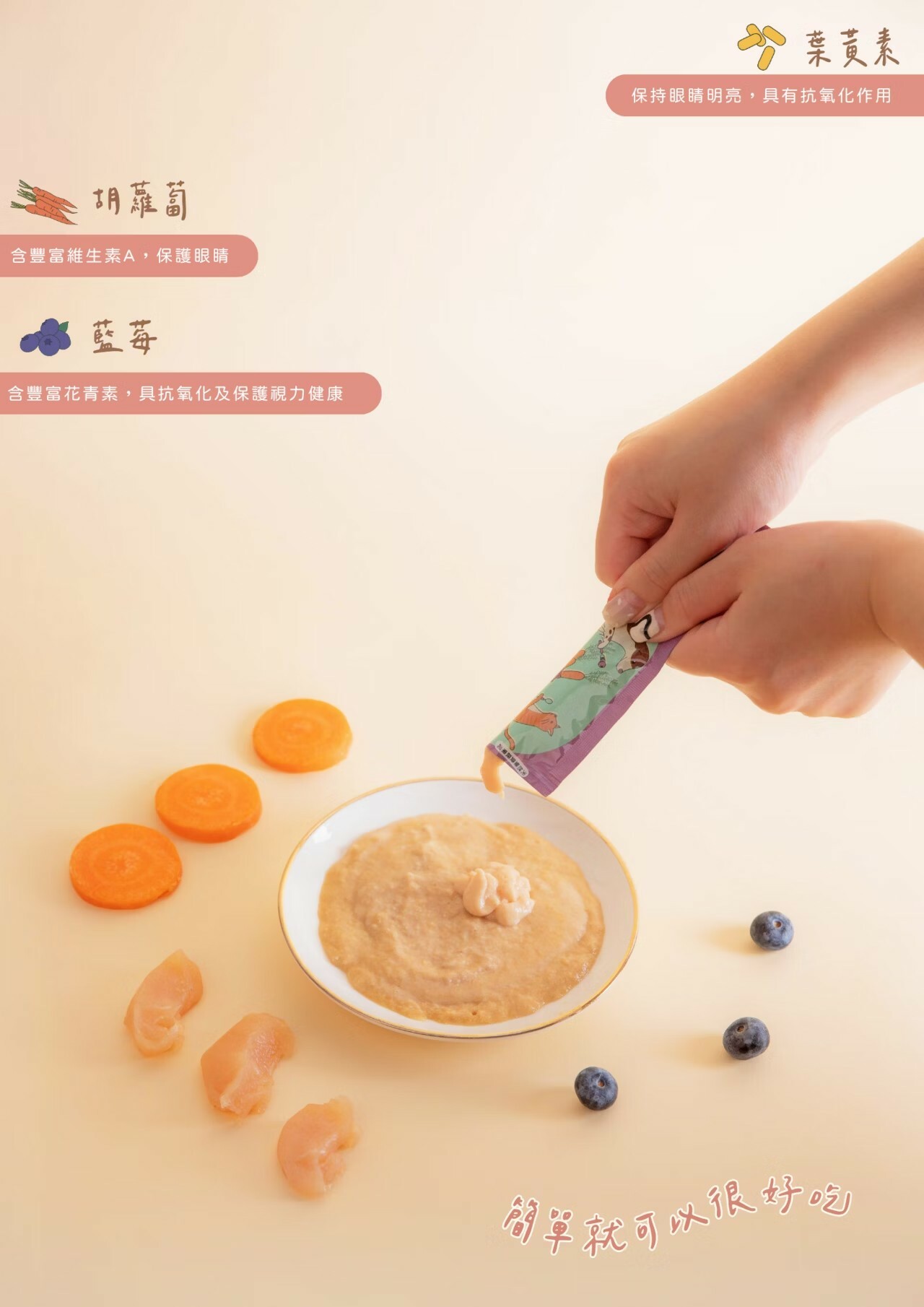 成分: 雞胸肉、藍莓、胡蘿蔔、葉黃素、木薯、純淨水